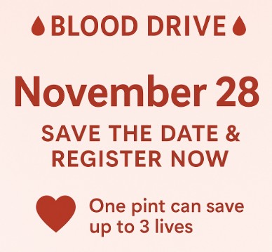 Our next blood drive is officially scheduled for Thursday, November 28.