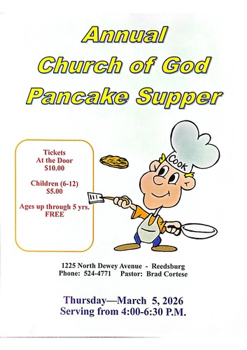 Annual Pancake Supper. Reedsburg Church of God, 1225 N. Dewey Ave. Reedsburg. Tickets: At the Door: $10. Children ages 6-12 $5 each. Ages up through 5 yrs FREE