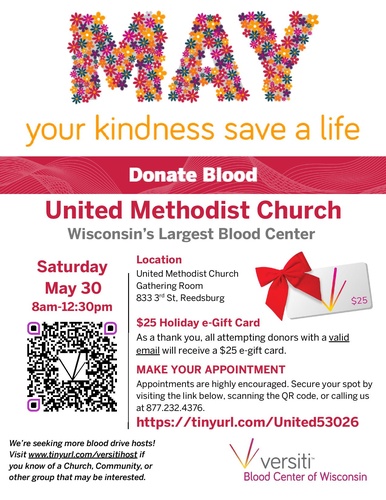Reedsburg United Methodist Church is hosting a Versiti BloodCenter Blood Drive.