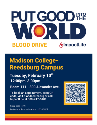 Mark your calendars! Madison College - Reedsburg Campus is hosting "Put Good into the World" Blood Drive with ImpactLife. Join us at Madison College – Reedsburg Campus for a blood drive on February 10th. We need your help to fill the donor schedule and make a meaningful difference in our community.