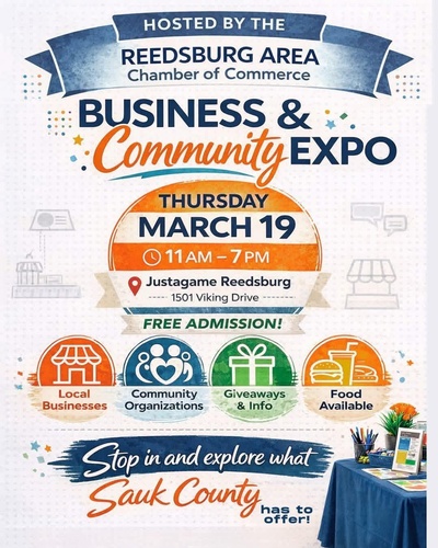 Please join us on Thursday, March 19, 2026 at Justagame Reedsburg, 1501 Viking Drive, for a Business and Community Expo that will run from 11:00 am – 7:00 pm.