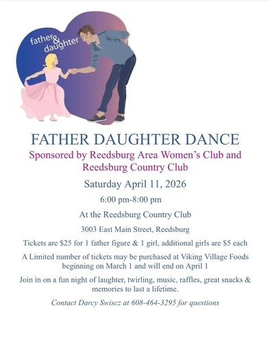 Winter is clicking away inching closer to spring and the annual Father Daughter Dance sponsored by the Reedsburg Area Women's Club and Reedsburg Country Club. Save Saturday, April 11th, for a night out with dad, or any father figure, and his girl(s).