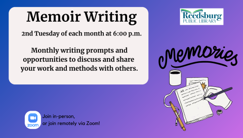 The Reedsburg Public Library Memoir Group meets on the 2nd Tuesday of each month at 6:00 p.m.