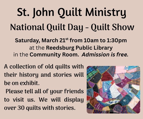 Join the St. John Quilt Ministry at the Reedsburg Library in the Community Room with their display of quilts. A collection of old quilts with their history and stories will be on exhibit.
