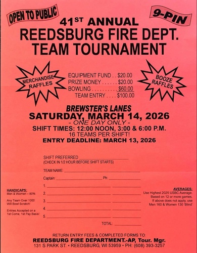 The Reedsburg Fire Department 41st annual 9 pin bowling tourney will be held on Saturday, March 14th, 2026. This event will be held at Brewster’s Lanes and is open to the public.