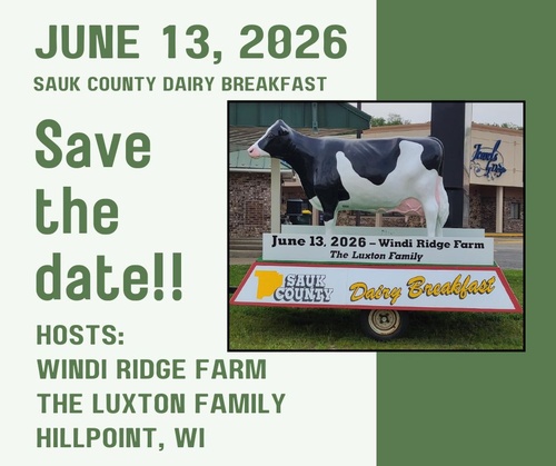 The 2026 Sauk County Dairy Breakfast will be held Saturday, June 13, 2026 at the Windi Ridge Farm - The Luxton Family! We are excited for another great dairy breakfast this year!