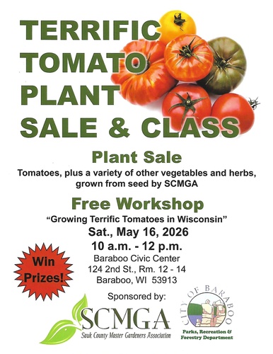 The Tomato Plant Sale will offer a variety of tomatoes, plus a variety of other vegetables and herbs, grown from seed by seed by the Sauk County Master Gardeners Association.
