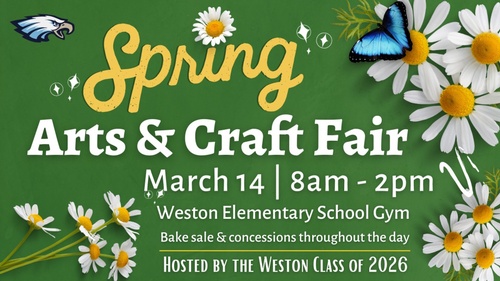 Weston Class of 2026 is excited to share they will be hosting the 4th Annual Spring Arts & Craft Fair on Saturday, March 14th from 8:00 a.m. to 2:00 p.m. Don't miss the opportunity to shop 70 booths for spring crafts in the Weston Elementary Gym. Concessions will be served throughout the event.